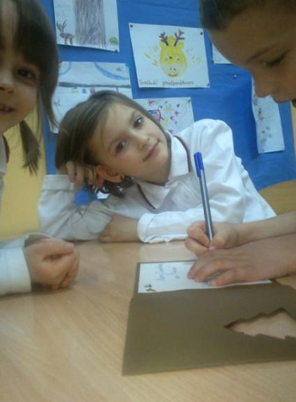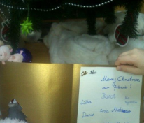 Zrobiliśmy również kartkę świąteczną, napisaliśmy życzenia i wysłaliśmy do naszych przyjaciół. Wraz z kartką, do Łotwy poleciały również nasze reporterki- trzy pluszowe świnki, zwane przez dzieci „pigies”. Ich zadaniem jest „stworzyć” reportaż dotyczący pracy naszych przyjaciół nad naszym wspólnym projektem. Niedługo „pigies” do nas powrócą i wszystko „opowiedzą”. Już nie możemy doczekać się efektów tej misji!