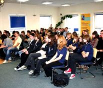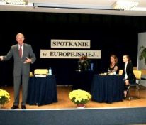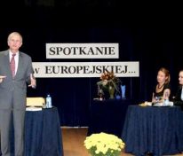 Drugą część spotkania w konwencji wywiadu i konferencji prasowej poprowadziły uczennice klasy maturalnej IB 2 – Ola Bykowska i Kasia Tokarz. Padały pytania o udział Profesora w rządzie, o prywatyzację, o wejście Polski do strefy euro, o Klub Bilderberg…