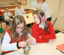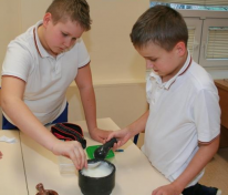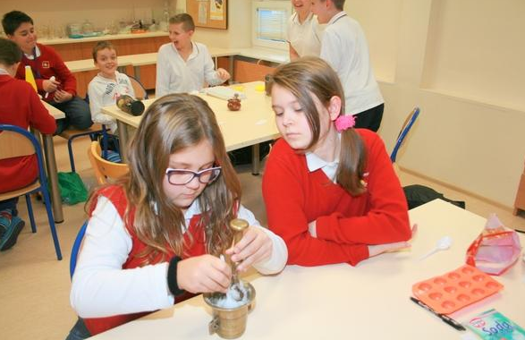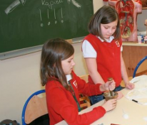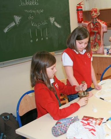 Uczestnicy profilu przyrodniczego nie zwalniają tempa… Produkcja mydełek podsunęła Hani pomysł na stworzenie musujących kuleczek do kąpieli. W tym celu klasa podzieliła się na trzy zespoły. Każdy zespół zmieszał w dużym moździerzu: kwasek cytrynowy, sodę oczyszczoną, odrobinę mąki ziemniaczanej oraz olej. Aby kuleczki pięknie pachniały dodaliśmy do tych mieszanin po kilka kropel olejków eterycznych. W całej sali zapachniało magnolią, trawą cytrynową, skórką pomarańczy i innymi wspaniałymi woniami. Oczywiście dodaliśmy także barwniki, aby kąpiel była kolorowa. Jak dotąd zadanie wydaje się proste… Największe wyzwanie stanowiło żmudne ucieranie wszystkich składników w moździerzach. Na koniec przełożyliśmy masę do foremek i czekaliśmy aż zastygną. Niektórzy już się wykąpali we własnej kolorowej, musującej kąpieli! Jaka to satysfakcja zrobić to samemu, zamiast kupować w sklepie…