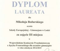Dyplom laureata Olimpiady Języka Francuskiego odebrał uczeń klasy III, Mikołaj Bzurski.