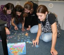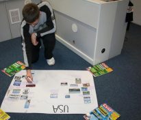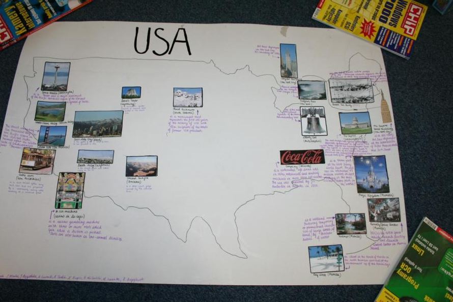 Jedna grupa rysowała mapę konturową USA, druga układała puzzle z mapą Ameryki z podziałem na stany, a pozostali wyszukiwali w Internecie informacji o wyznaczonych miejscach i budowlach oraz drukowali ich ilustracje. Zadaniem wieńczącym dzieło było umieszczenie na mapie konturowej krótkich notek i obrazków wyszukanego miejsca np. Rushmore Mountain lub Death Valley. Dzięki tej lekcji dowiedzieliśmy się wiele na temat rozmieszczenia poszczególnych stanów jak i znaleźliśmy miejsca, które warto byłoby zobaczyć na żywo. Była to swego rodzaju podróż palcem po mapie.