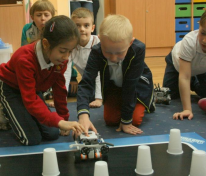 Na początku młodzi konstruktorzy musieli z elementów klocków LEGO Mindstorms skonstruować własnego robota, opierając się na instrukcji wyświetlanej na ekranie komputera. Po wykonaniu tej czynności, wykwalifikowani instruktorzy pomogli najmłodszym tak zaprogramować maszyny, by te wykonywały określone polecenia. Głównym zadaniem skonstruowanych przez uczniów robotów było uprzątnięcie planszy pełnej plastikowych kubeczków w możliwie najkrótszym czasie. Dzieci z dużym zaciekawieniem przyglądały się rywalizacji powstałych maszyn i entuzjastycznie reagowały na przebieg niecodziennych zawodów.