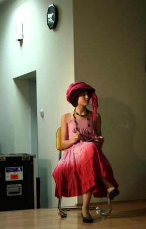 Przyciemnione światła, biały reflektor rozświetla środek sceny. W tle gra cicha muzyka, na sali siedzi protokolant.