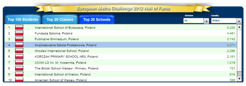 W rankingu ogólnopolskiego konkursu matematycznego wzięli udział uczniowie klas 4-6. Zajęliśmy 4-te miejsce! W rankingu klasowym ogólnopolskim najlepiej wypadła klasa 5, a najwięcej punktów zdobyła Julia Biernacka. Serdecznie gratulujemy!