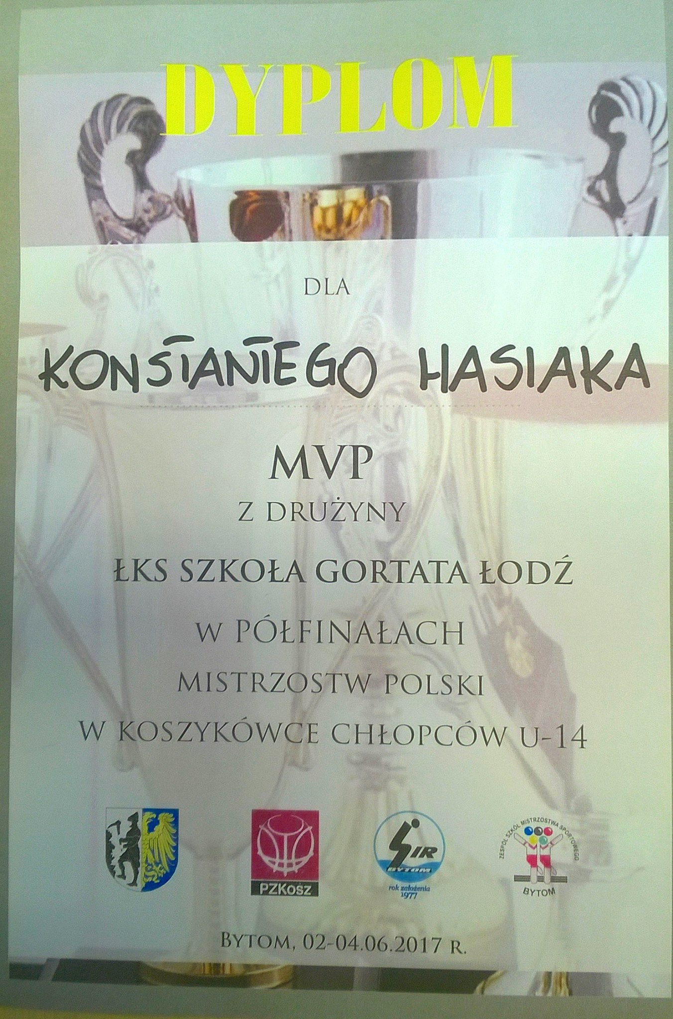 Uczeń Konstanty Hasiak z tytułem MVP w Półfinałach Mistrzostw Polski MessengerWhatsApp Nasz uczeń – Konstanty Hasiak (z drużyny ŁKS Szkoła Gortata Łódź) otrzymał zaszczytny tytuł MVP w Półfinałach Mistrzostw Polski w Koszykówce Chłopców U-14. Brawo!!!