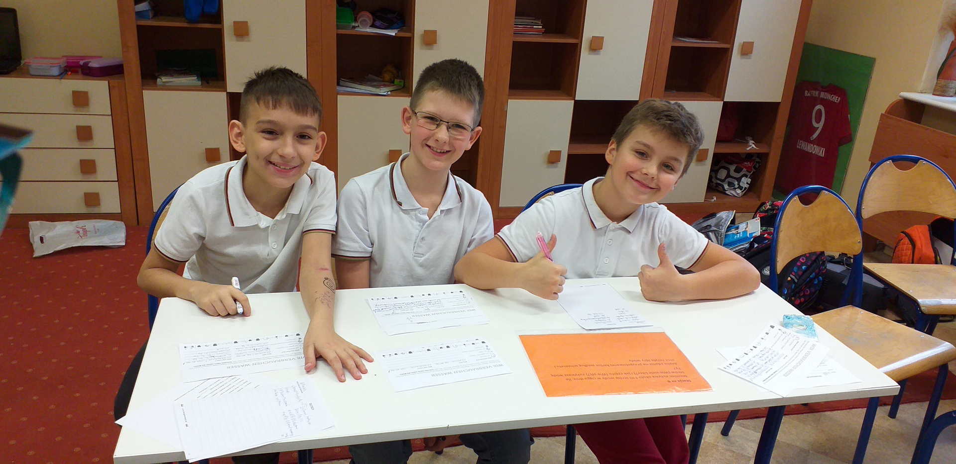 Uczniowie klas VIII, VIa i VIb oraz Va i Vb pracowali w grupach metodą stacji, poznając trudne słownictwo związane z tematem. Ulubionym zadaniem zostało dopasowywanie odpowiednich nazw do rodzajów śmieci. Dzieci świetnie bawiły się również przy „ekologicznej” piosence, a także przy prowadzeniu obliczeń dziennego zużycia wody. Wszyscy uczniowie stworzyli galerię – słowniczek obrazkowy z najtrudniejszymi pojęciami typu Mülltrennung, czy Müllverbrennungsanlage. 🙂
