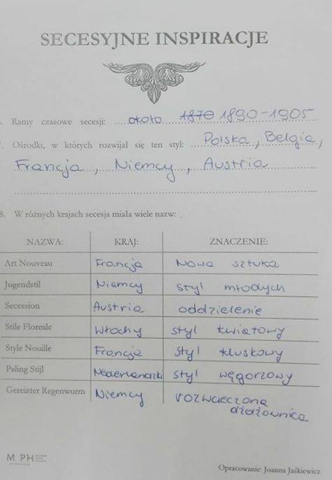 W grudniu profil artystyczny uczestniczył w zajęciach dotyczących stylu secesyjnego w Muzeum Pałacu Herbsta. Podczas nich poznaliśmy wiele ciekawostek o właścicielach pałacu, a także o cennych i obecnie bardzo modnych tapetach Morrisa. W części praktycznej warsztatów kształciliśmy technikę kaligrafii w stylu secesyjnym.