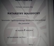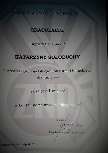Kasia Sołoducha (uczennica I klasy naszego gimnazjum) wzięła udział w Ogólnopolskim Konkursie Literackim „Piękno naszego języka w codzienności umyka” zorganizowanym przez Związek Nauczycielstwa Polskiego. Zadanie konkursowe polegało na ułożeniu fraszki promującej poprawną, literacką polszczyznę. Kasia zajęła I miejsce w kategorii juniorów i jej fraszka: